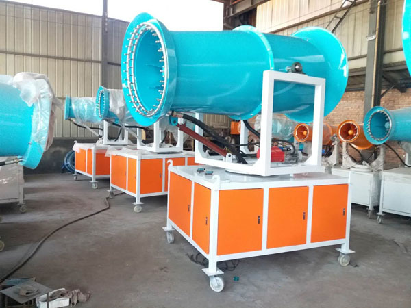 除尘雾炮机当风机旋转时,在喷雾机的出风管内产生高速气流,把喷头喷出的雾化水雾通过高压气流将雾滴进一步雾化成更细小的雾滴后吹向靶标。除尘雾炮机的喷雾量由调量阀进行控制,除尘雾炮机喷出的雾滴大小可以通过改变水泵压力来进行调整,除尘雾炮机的喷射方向可以通过改变出风管的位置来进行调节(自动型除尘雾炮机可以